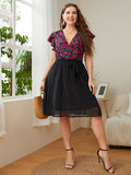 Plus Size Floral Surplice Neck Flutter Sleeve Dress